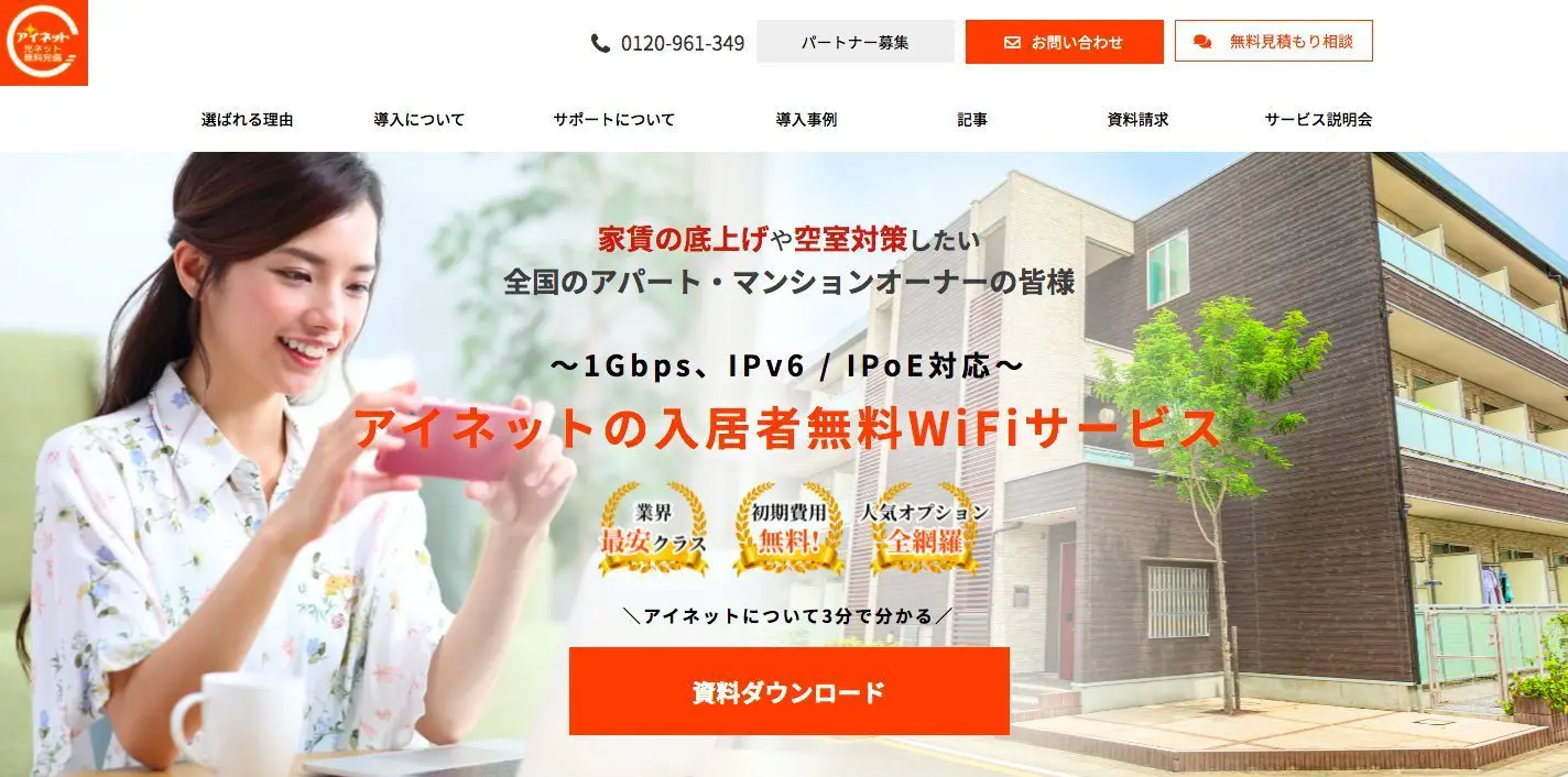 中核となるネットワーク事業では、全国のアパート・マンションオーナーの皆様へ、入居率向上の付加価値として入居者無料Wi-Fiサービス「アイネット」のご提案を行っております。賃貸物件の中でも10世帯前後の集合住宅を中心にサービスをご提案しています。