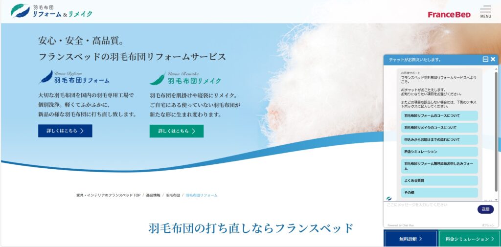 羽毛布団のリフォームページでは、離脱ポイントやチャットへの到達ルートを測定して、チャット利用をさらに促進したいと考えています。ChatPlusは接続性が強みですので、パラメータ設定などもスムーズに対応できると思います。ECサイトは個人情報や社内システムとの接続が必要なため、セキュリティ面の確保が重要ですが、VPN経由での接続が可能とのことですので実現できると考えています。