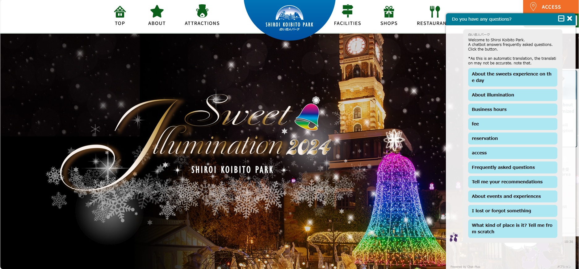 白い恋人パーク ホームページの日本語/英語/中国語の各ページに、それぞれの言語のチャットボットを設置して、よく聞かれる質問を表示し、自動回答できるようにしています。日本語のページではお客様のフリーワード入力へも対応できるようにしています。