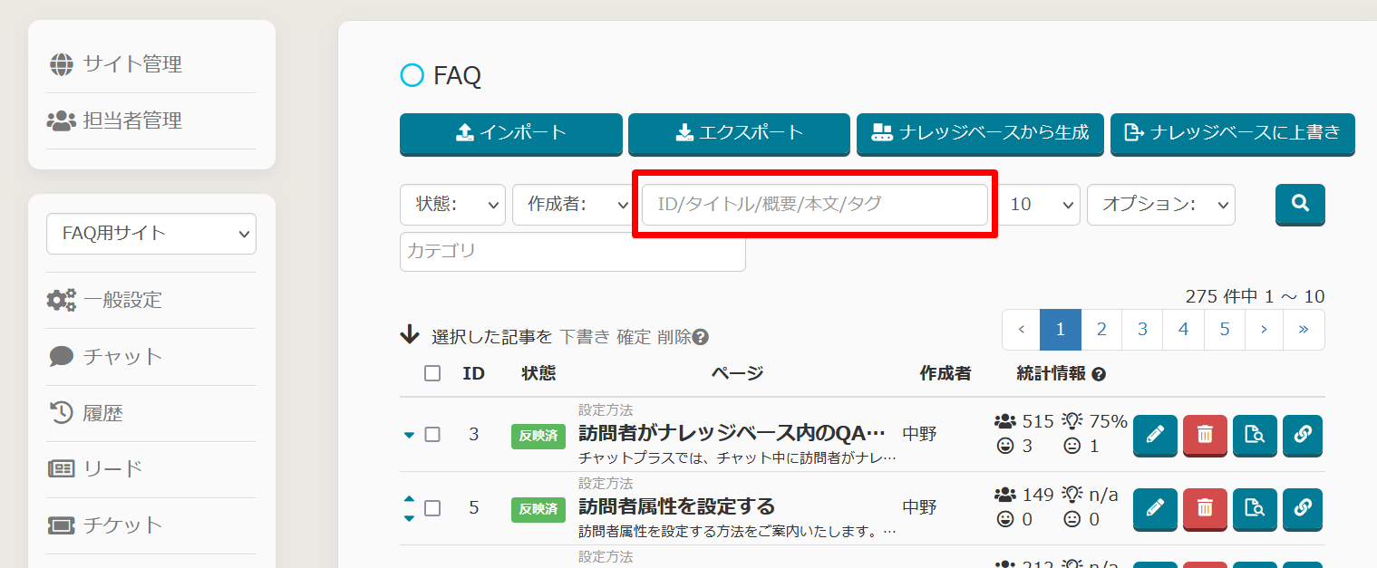 FAQページ機能 管理画面内で「本文」「ソース」から記事が検索できる機能の追加
