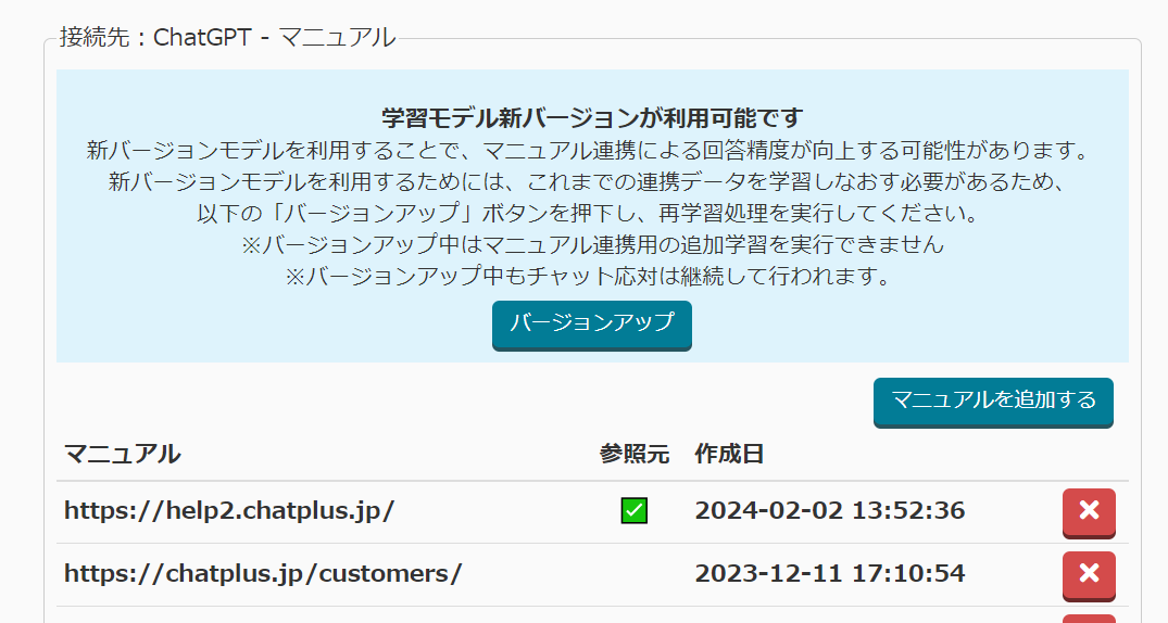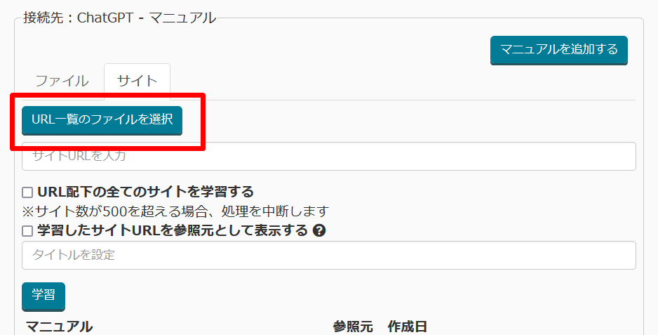 資料やURLから直接回答を生成する機能、「ChatGPTマニュアル連携」使用時、学習元のURLをCSVファイルから指定できるようになりました。