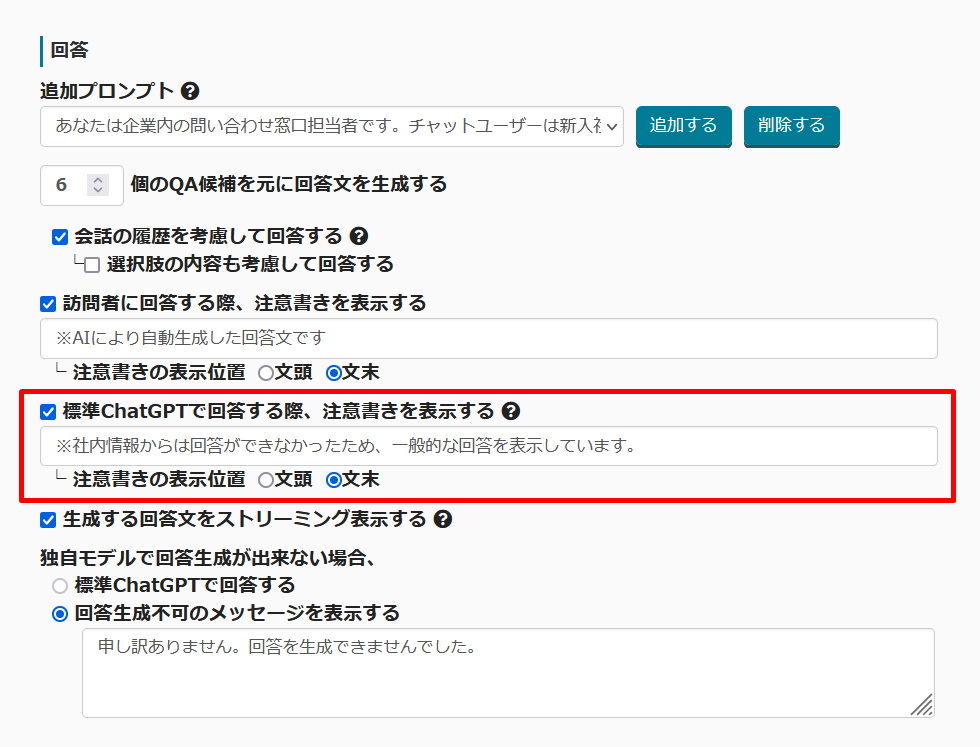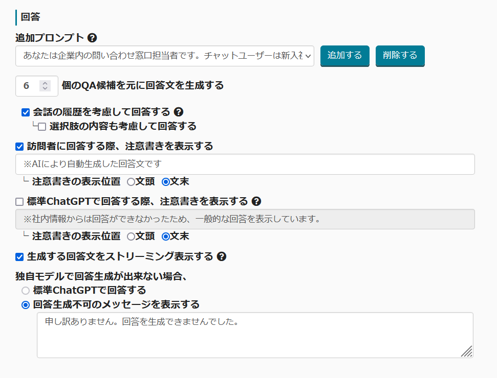 学習データから回答ができなかったときに、指定の文言を表示したのち、ChatGPTの回答ができる機能を追加しました。