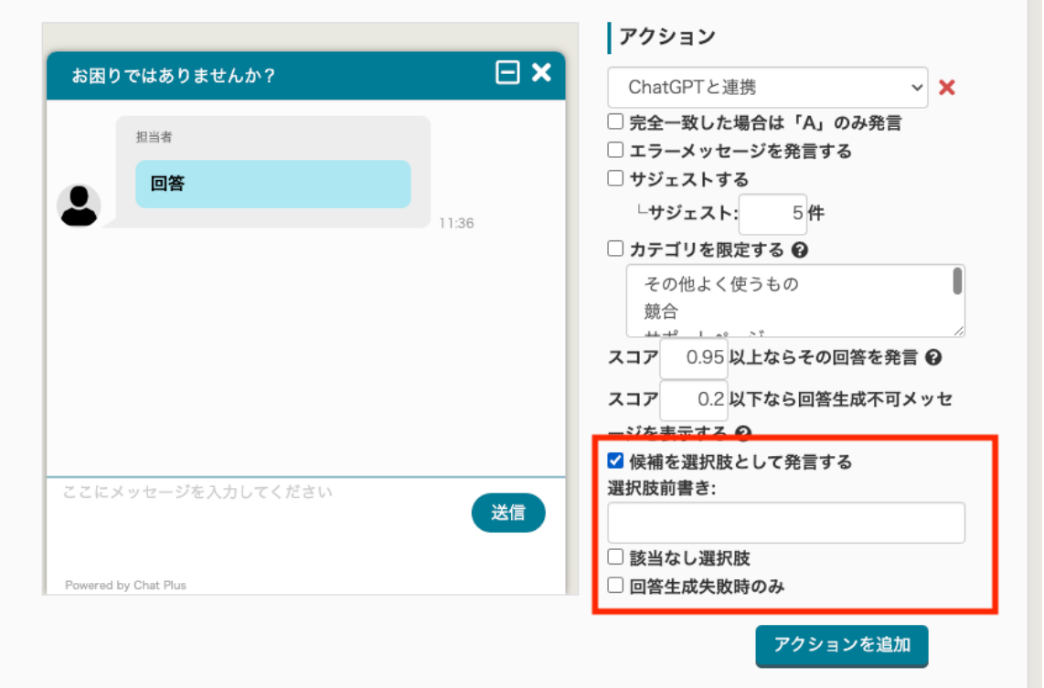 生成AIで「Q&A」から回答を生成できる機能、「ChatGPTフリーワード」を使用した際、回答と同時に候補の選択肢を表示できる機能を追加しました。