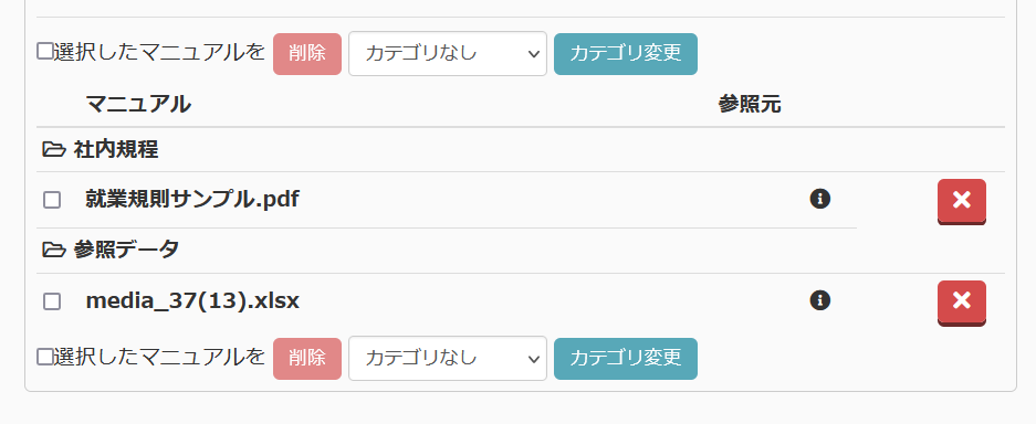 資料から直接回答を生成する機能、「ChatGPTマニュアル連携」において、学習済みのファイルをカテゴリ分けして管理できるようになりました。