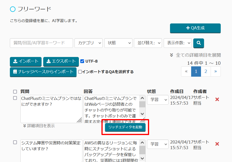 フリーワード(Q&A)から回答を生成する機能、「ChatGPTフリーワード連携」において、フリーワード(Q&A)登録画面からリッチエディタを起動できるようになりました。
