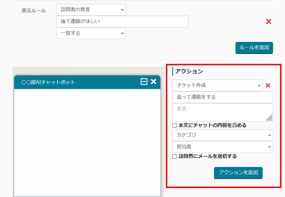 チャットボット+のアクションに「チケット作成」を追加