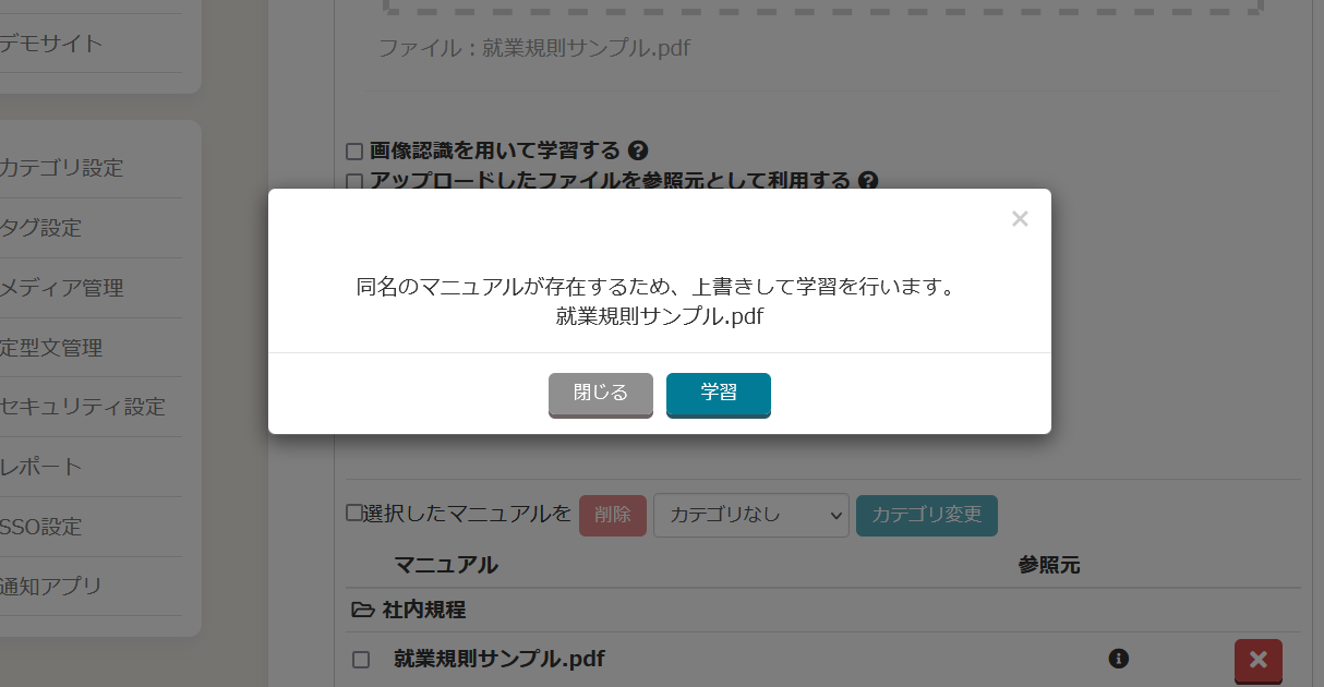 資料から直接回答を生成する機能、「ChatGPTマニュアル連携」において、資料を学習するときに同一のファイル名だった場合、上書きができるよう機能を追加しました。