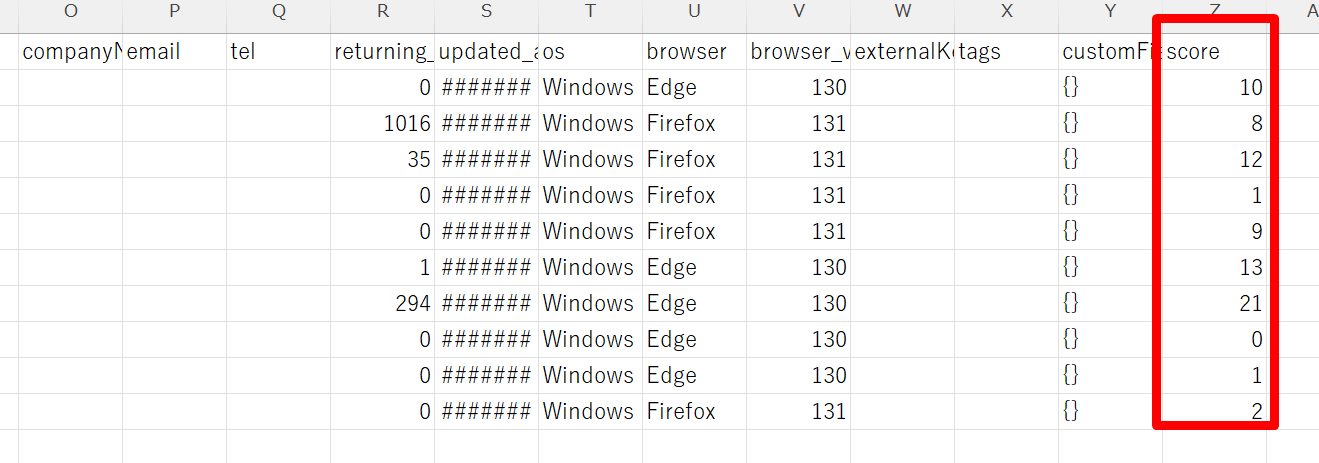 訪問者をCSVファイルにダウンロードした際、score列にスコアが入るようになりました。