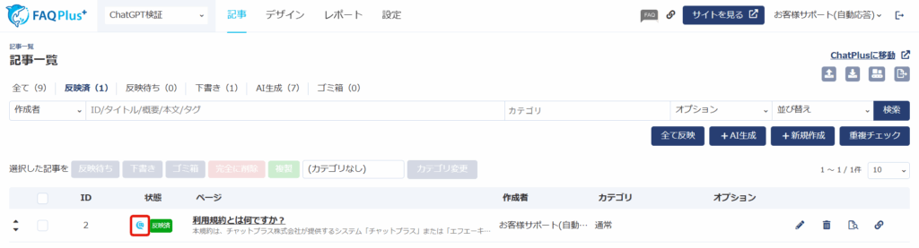 AI検索対応のFAQシステム、FAQPlusで記事を公開すると、ChatPlus(AIチャットボットプラン)に自動で学習されるようになりました。