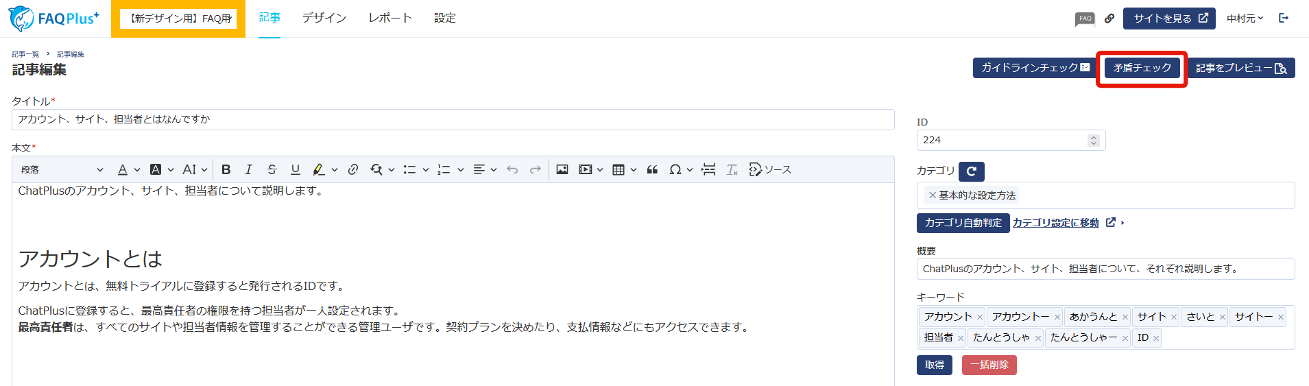 AIエージェント協働型FAQシステム、FAQPlusで作成中の記事が他の記事と矛盾していないかAIが自動で確認をする機能を追加しました。