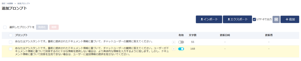 生成AIの回答調整に使用する「追加プロンプト」機能の上限を1,500文字から2,500文字に拡張しました。