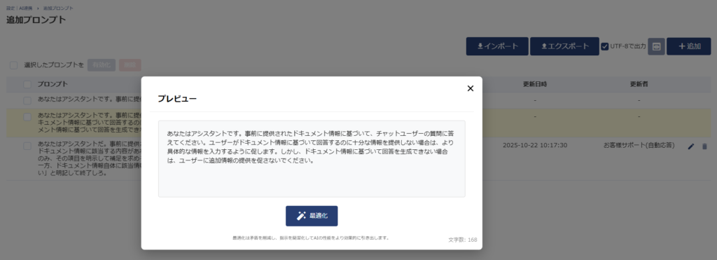 生成AIの回答調整に使用する「追加プロンプト」に、新規作成用のテンプレートと、AIが理解しやすいよう最適化をする機能を追加しました。