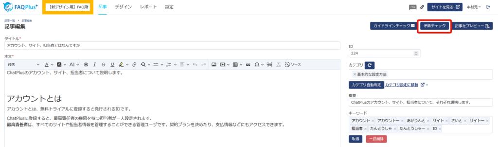 AIエージェント協働型FAQシステム、FAQPlusで誤字や脱字のチェック、見出し・改行の調整提案や画像の挿入提案など、AIのガイドラインチェック機能を強化しました。
