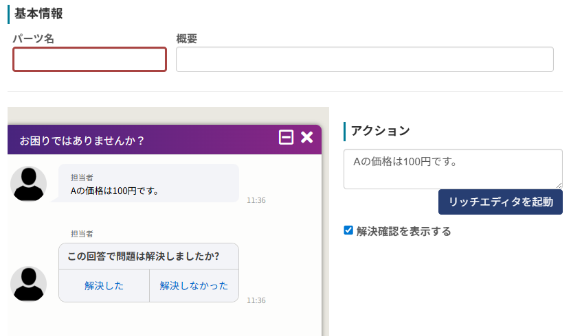 ツリーエディタのパーツ「メッセージ」の設定画面内で解決確認を設定できるようになりました。