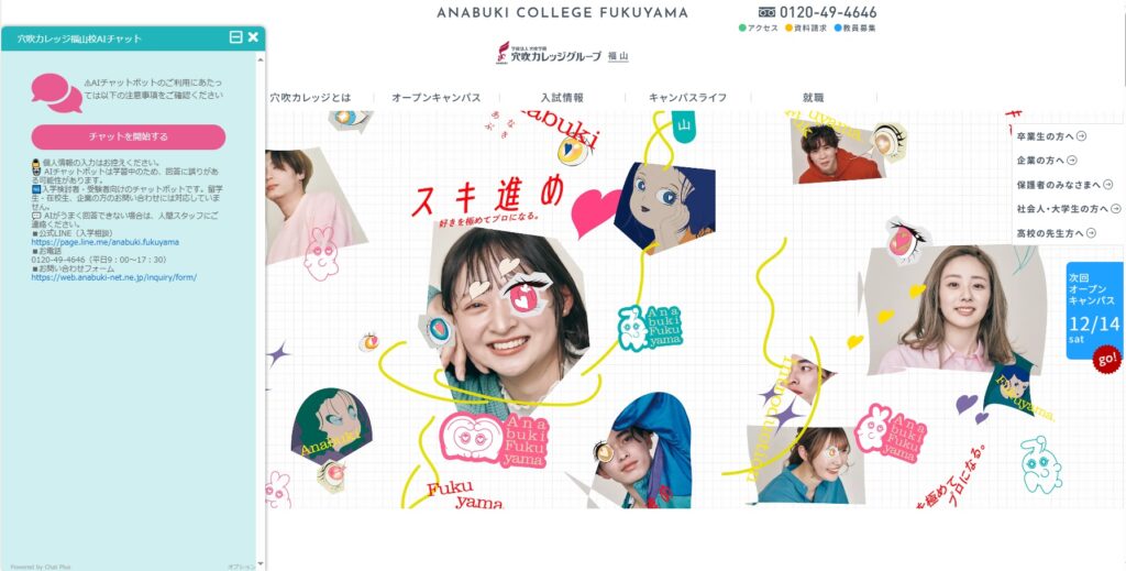 昨年あたりから生成AIと連携したAIチャットボットが急速に普及し始め、AIチャットボットが学生募集でも有効ではないかと検討を始めました。福山校でぜひやってみたいということだったので、福山校のホームページにChatPlusのAIチャットボットを設置することになりました。