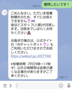 公式LINEでは、夜間などに問い合わせがあった場合は、自動でAIチャットへ流すようにしています。以前は、LINEでの返信がある朝まで待ってもらっていました。ほとんどの人がAIへ同じ質問をしてくれています。すぐに回答がもらえるので、利用者の満足度も高まっていると思います。自分自身の対応時間を減らしたいというのもありましたが、体感で、問い合わせへの対応時間は以前の5分の1程度になっていると思います。