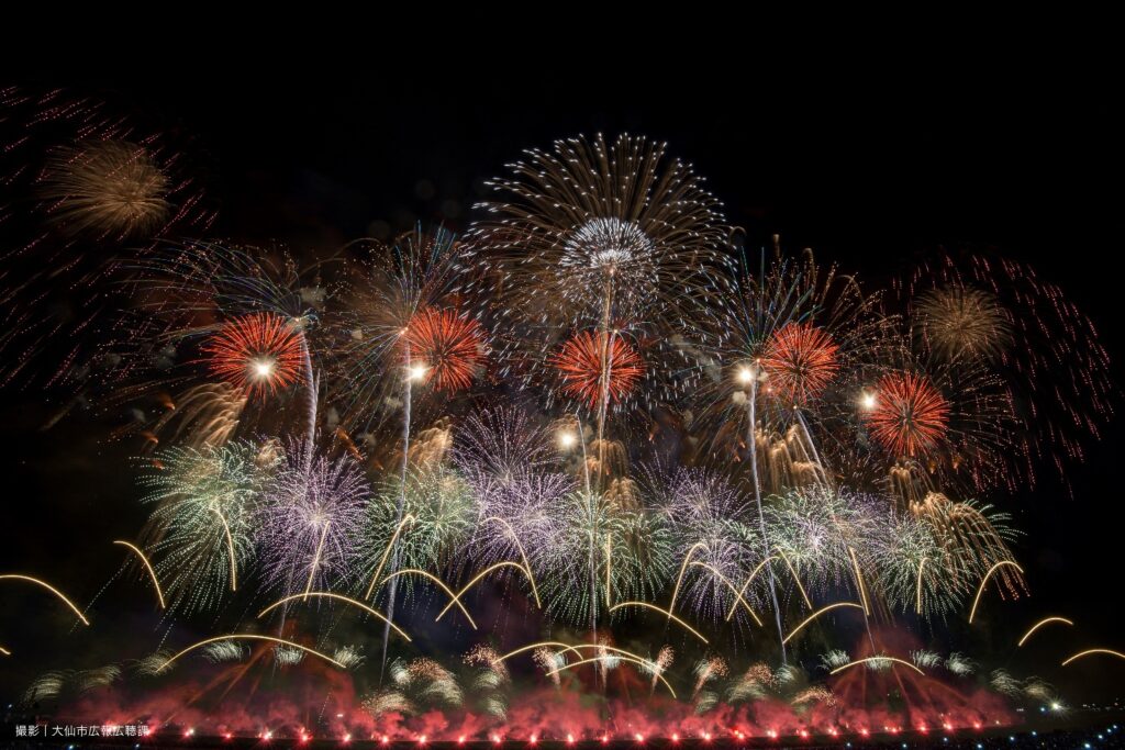 秋田県大仙市で開催される全国花火競技大会「大曲の花火」は、日本を代表する花火大会として、毎年10万人以上の観客を魅了しています。その起源は1910年(明治43年)、地元の諏訪神社祭典の余興として始まった花火大会にさかのぼります。以来100年以上の歴史を重ね、現在では全国から選りすぐりの花火師たちが集い、技術と芸術性を競い合う格式高い競技大会へと発展しました。最優秀作品には内閣総理大臣賞が授与されるなど、花火師にとっては名誉ある舞台です。中でも大会提供花火は、幅900メートルにも及ぶ壮大なワイドスターマインで、音楽とシンクロした演出は圧巻です。