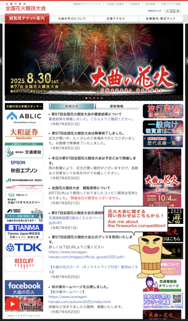 大仙市の花火産業推進課は、花火大会における駐車場や交通規制等に関する情報発信を、Webサイトや SNS を活用して行っています。「大曲の花火」春夏秋の3大会以外にも花火大会はありますので、それらの地域の花火大会における花火打上委託契約業務等も担当させていただいています。