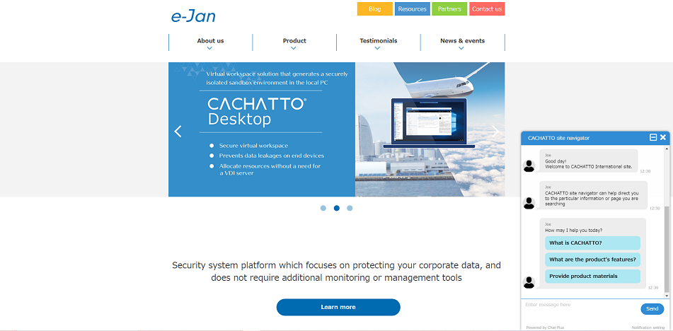 私たちe-Janネットワークスは「お客さまに『これ、e-Jan(いいじゃん)!』と言い続けていただく」をビジョンに掲げ、テレワークプラットフォームサービス「CACHATTO(カチャット)」やリモートアクセスサービス「NinjaConnect(ニンジャコネクト)」を提供している会社です。