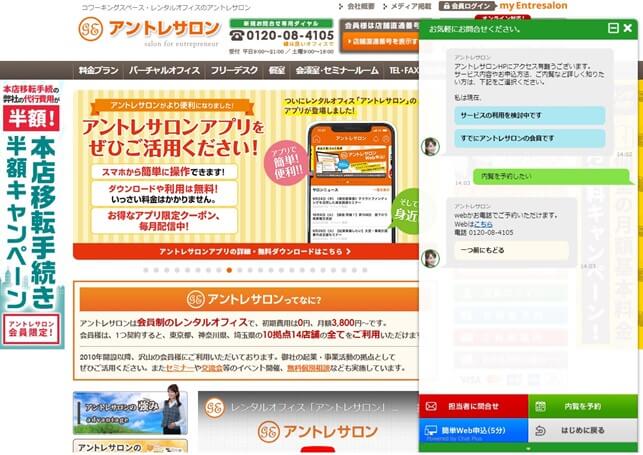 「アントレサロン」のWebサイトに、チャットボットを設置しており、新規のお客様や会員様の簡単なお問い合わせに対して、自動で応答できるようにしています。また、お客様の問い合わせしたい内容に応じて、有人でのチャット対応も行っています。