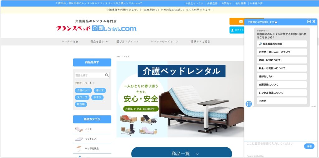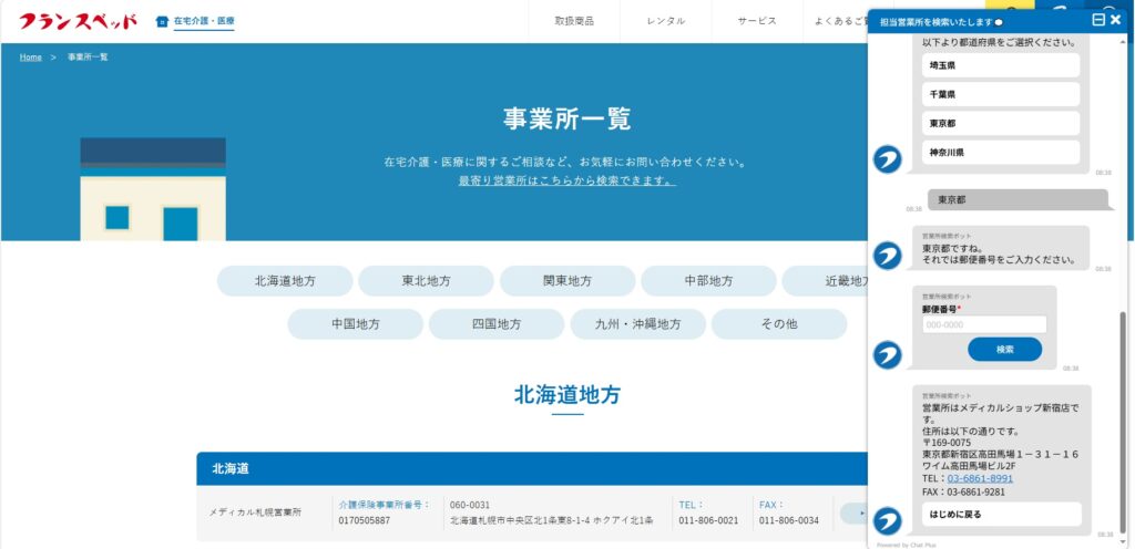 弊社では、隣り合った市町村区でも担当する営業所が別部署になる都道府県がいくつかあります。福祉用具レンタルは自治体と連携して行うことが多いため、お客様のご住所ではなく「郵便番号」で細かな担当営業所を割り出して、瞬時に表示させる仕組みを構築しようと検討しました。これを全国の津々浦々で実現しようとすると、高額なWeb改修を伴う検索機能の実装が必要ですが、チャットボットの活用であればそれが回避できると考えました。さまざまなチャットボットを比較検討しましたが、Webサイトの改修なしで導入可能であること、操作性の良さ、料金設定の良心性がChatPlusの魅力でした。また、ご担当者が「やってみせます!」とおっしゃってくださったのも、大変心強かったです。