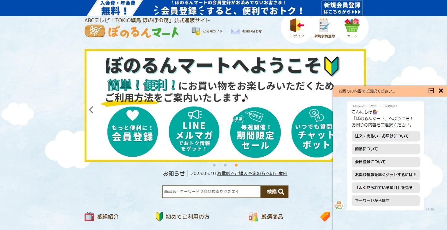 通販サイト「ぼのるんマート」にチャットボットを設置し、「注文・支払い・お届けについて」「商品について」「会員登録について」など、主に通販サイトの使い方について、チャットボットが自動回答しています。