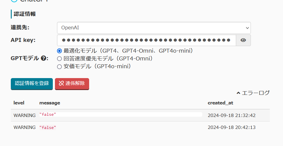 外部連携>アプリ>ChatGPTにエラーログを追加