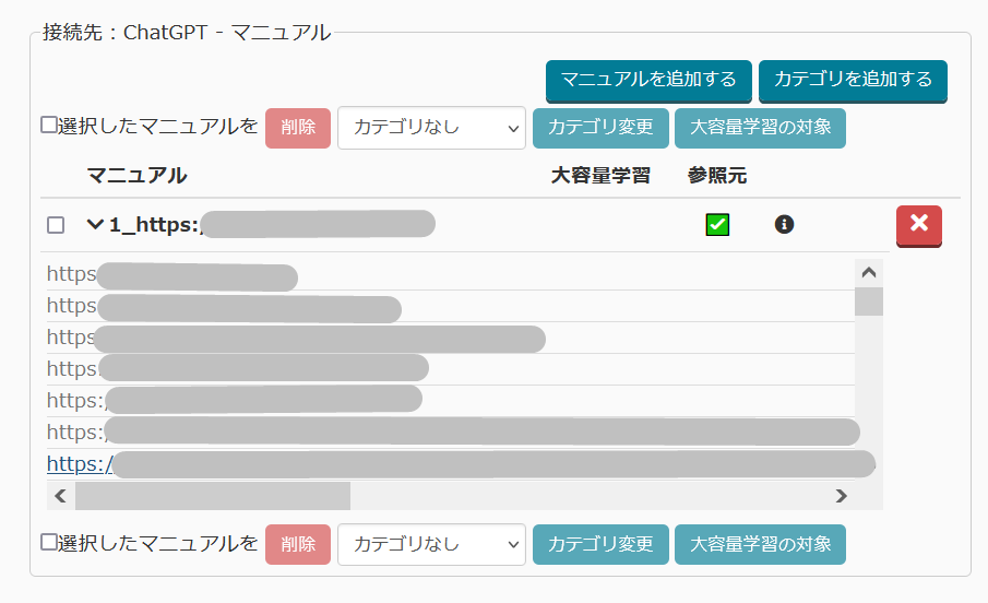 資料やURLから直接回答を生成する機能、「ChatGPTマニュアル連携」において、学習済みのURLの確認、削除ができる機能の追加をしました。