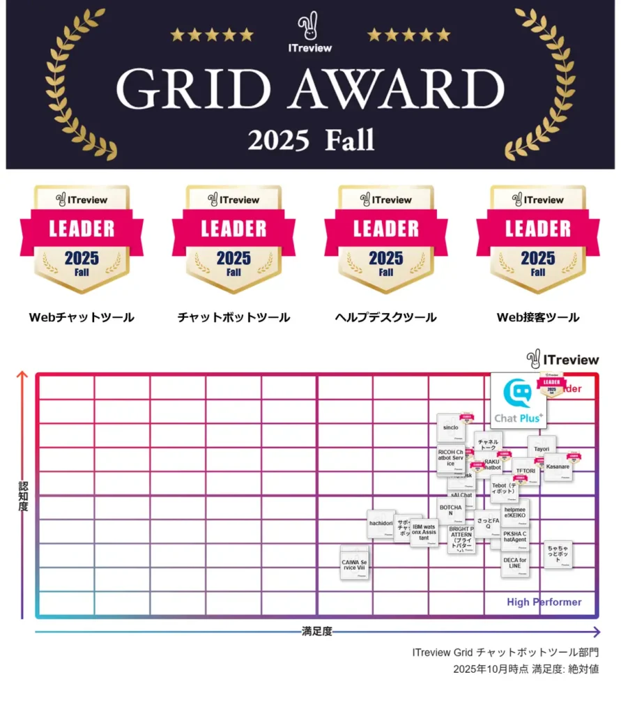 IT製品のレビューサイト「ITreview」において、チャットプラスが提供する「ChatPlus(チャットプラス)」は、「ITreview Grid Award 2025 Fall」にて、4部門においてLeaderを獲得し、これで25期連続の受賞となりました。