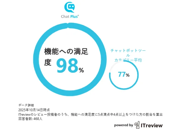 「ITreview」上でも、チャットボットツールカテゴリにおいて98%の機能満足度を獲得しており、多くのユーザーから確かな評価をいただいています。