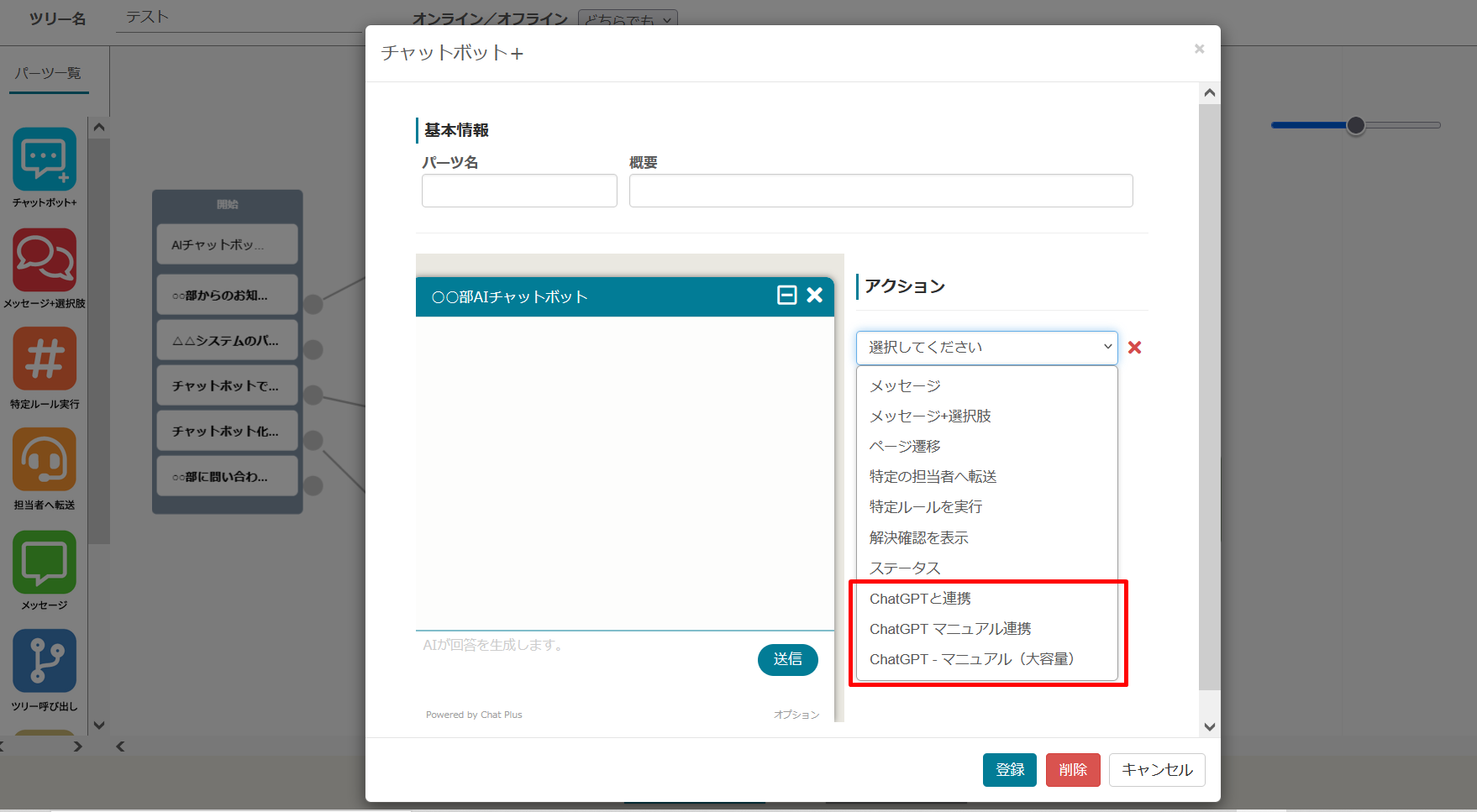 シナリオ型のチャットボットをツリー状に並べながら設定できるツリーエディタ機能において、「ChatGPTと連携」、「ChatGPTマニュアル連携」、「ChatGPTマニュアル連携(大容量)」を実行できるようになりました。