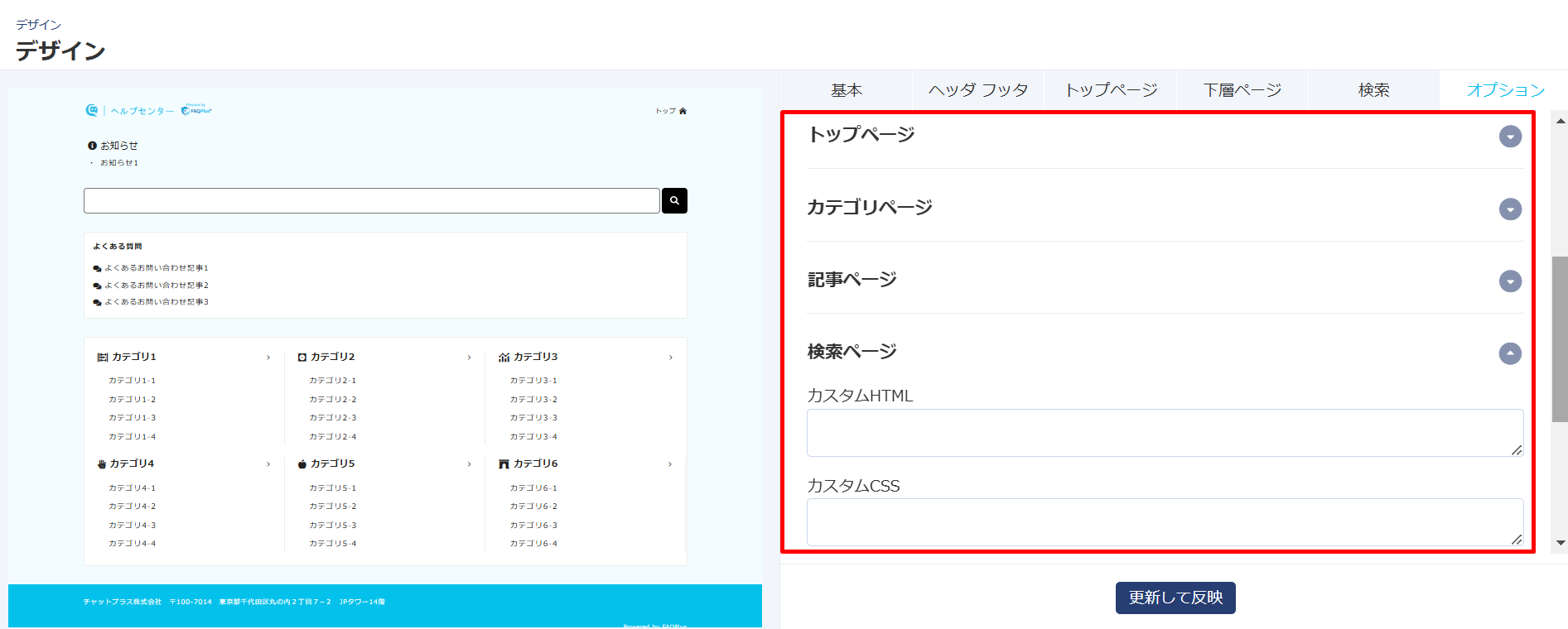 AI検索対応のFAQシステム「FAQPlus」において、カスタムHTML、CSSをトップページ、カテゴリページ、記事ページ、検索ページのそれぞれで指定できるようになりました。また各ページ共通のHTML、CSSも指定いただけます。