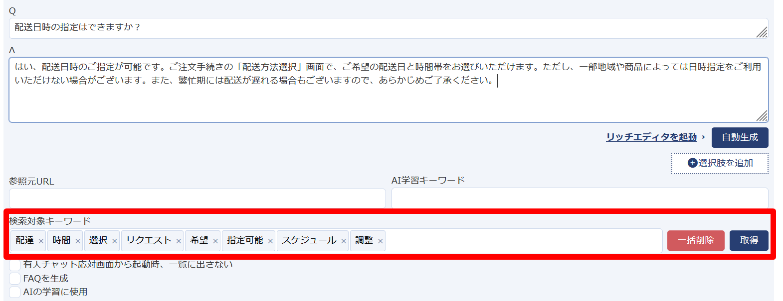 ナレッジベース、フリーワード、FAQPlusの記事タイトルにおいて、検索ワードを指定する「キーワード」の自動取得機能について、精度の改善をいたしました。より検索されやすいワードが自動で生成されるようになり、フリーワード入力の応答精度があがり、また設定もより簡単になりました。