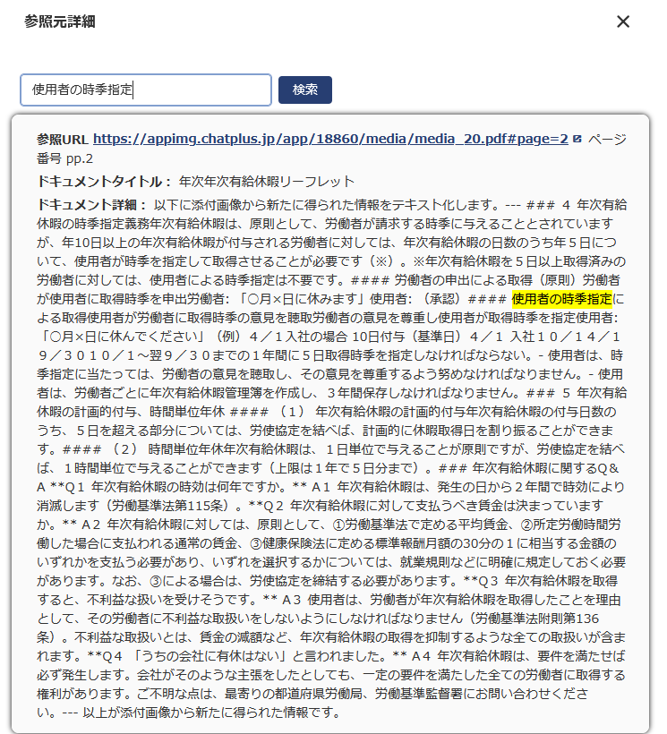 生成AI回答時の、回答元データを確認できる「回答元詳細」に検索機能を追加しました。これにより、学習済みデータの中から該当箇所をすばやく絞り込めるため、確認・改善・作業が効率的に行えます。