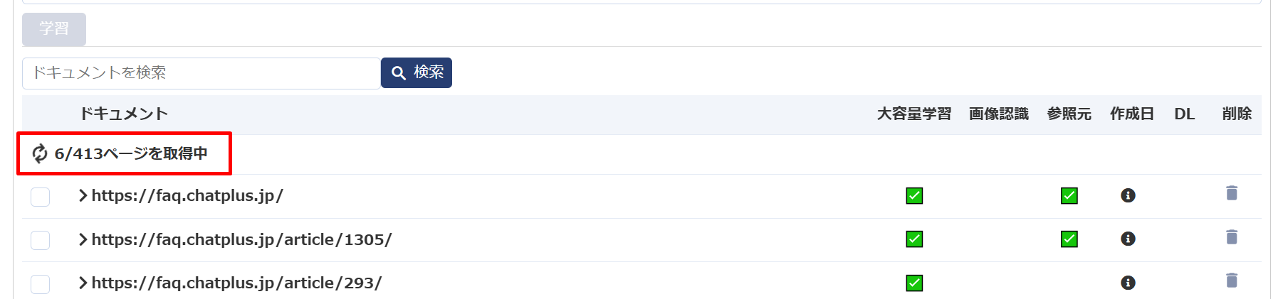 URLを学習中の際に、「◯/◯ページ 取得中」と進捗状況がリアルタイムで表示されるようになりました。これにより、今どれくらいのページが処理されているかが一目でわかり、完了の目安が立てやすくなりました。