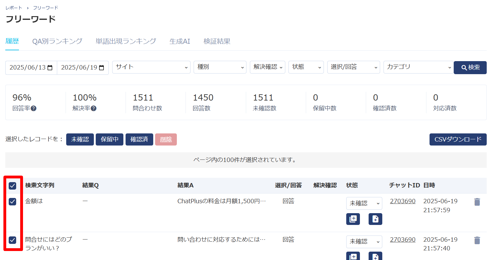 AIへの取り合わせ履歴としてご確認いただける「レポート」>「フリーワード」>「履歴」で、一括チェックができるようになりました。