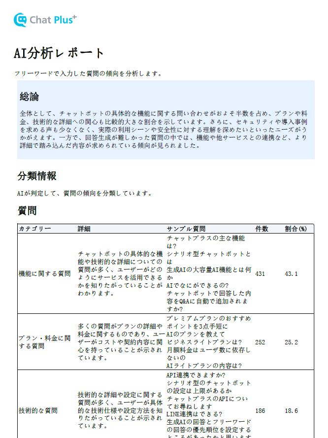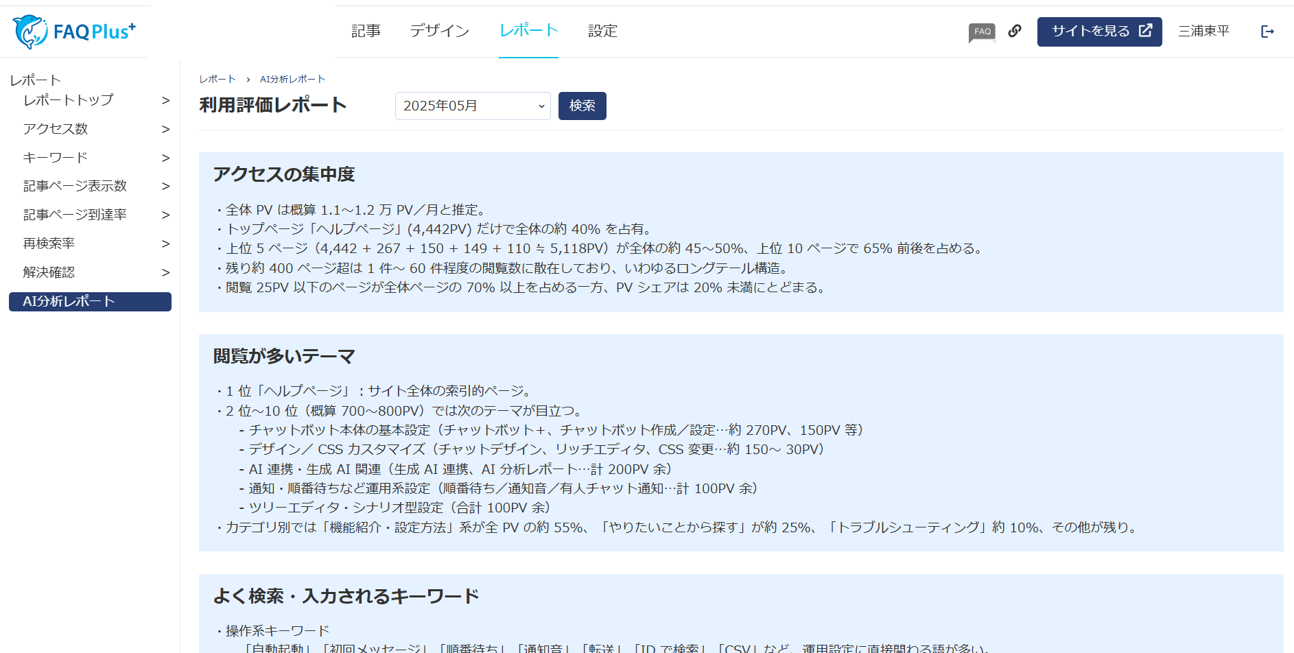 FAQPlusのAI分析レポートをリリースしました。アクセスの集中度、閲覧が多いテーマ、よく検索・入力されるキーワード、カテゴリ別のおおまかな傾向、ページ数と閲覧量の分布を自動集計し、AIがまとめます。このレポートを活用することで、ユーザーの関心や検索行動を可視化でき、どのトピックやカテゴリを優先的に整備すべきかが明確になります。