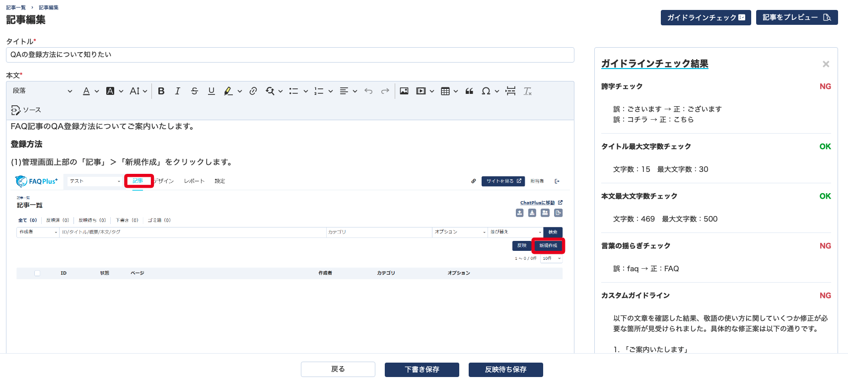 FAQPlusに、記事作成時の品質と一貫性を高めるためのレギュレーションチェック機能を追加しました。この機能では、誤字脱字といった基本的なミスだけでなく、あらかじめ設定された社内ルールや用語統一の基準が守られているかどうかを自動で判定できます。